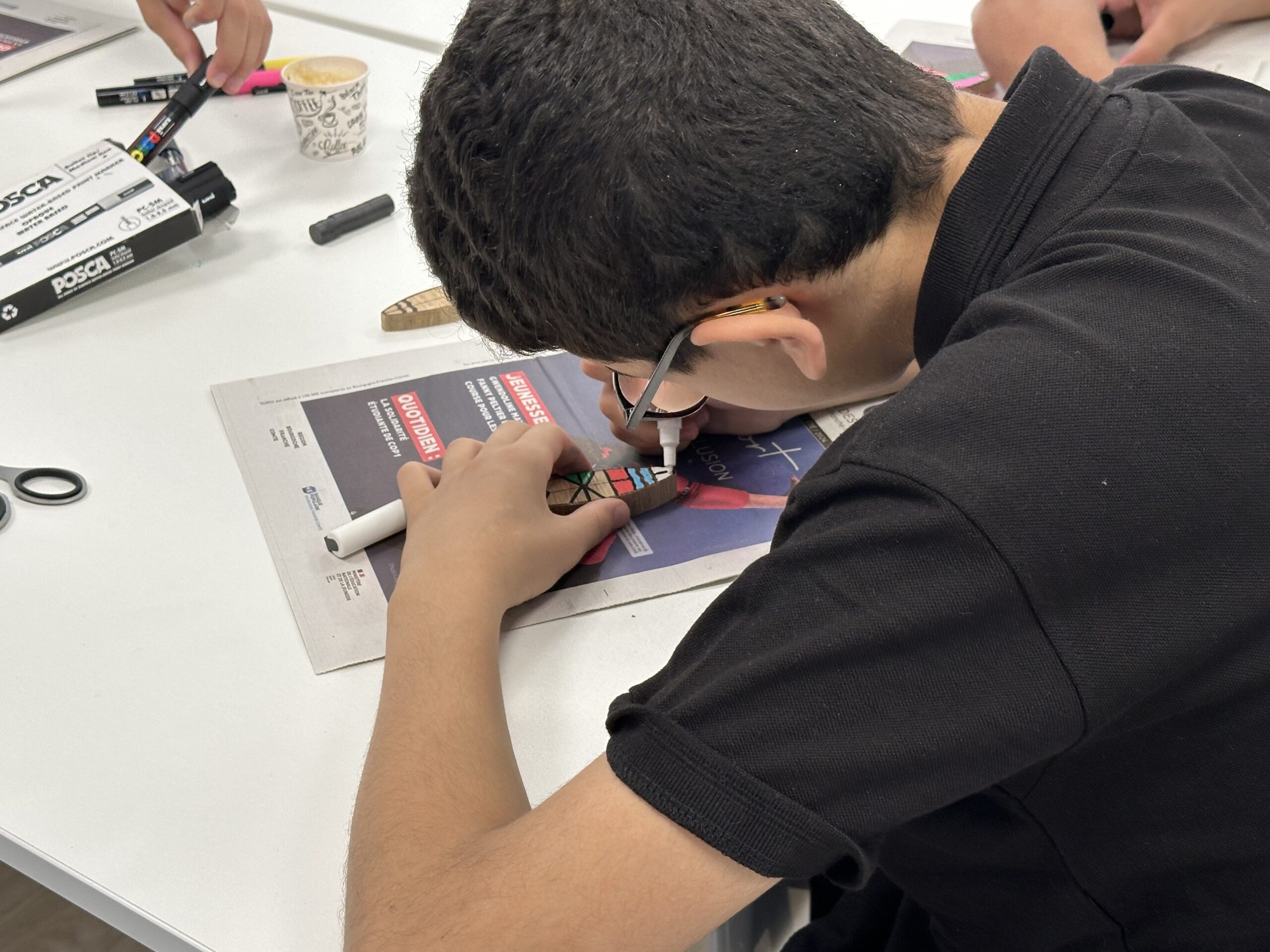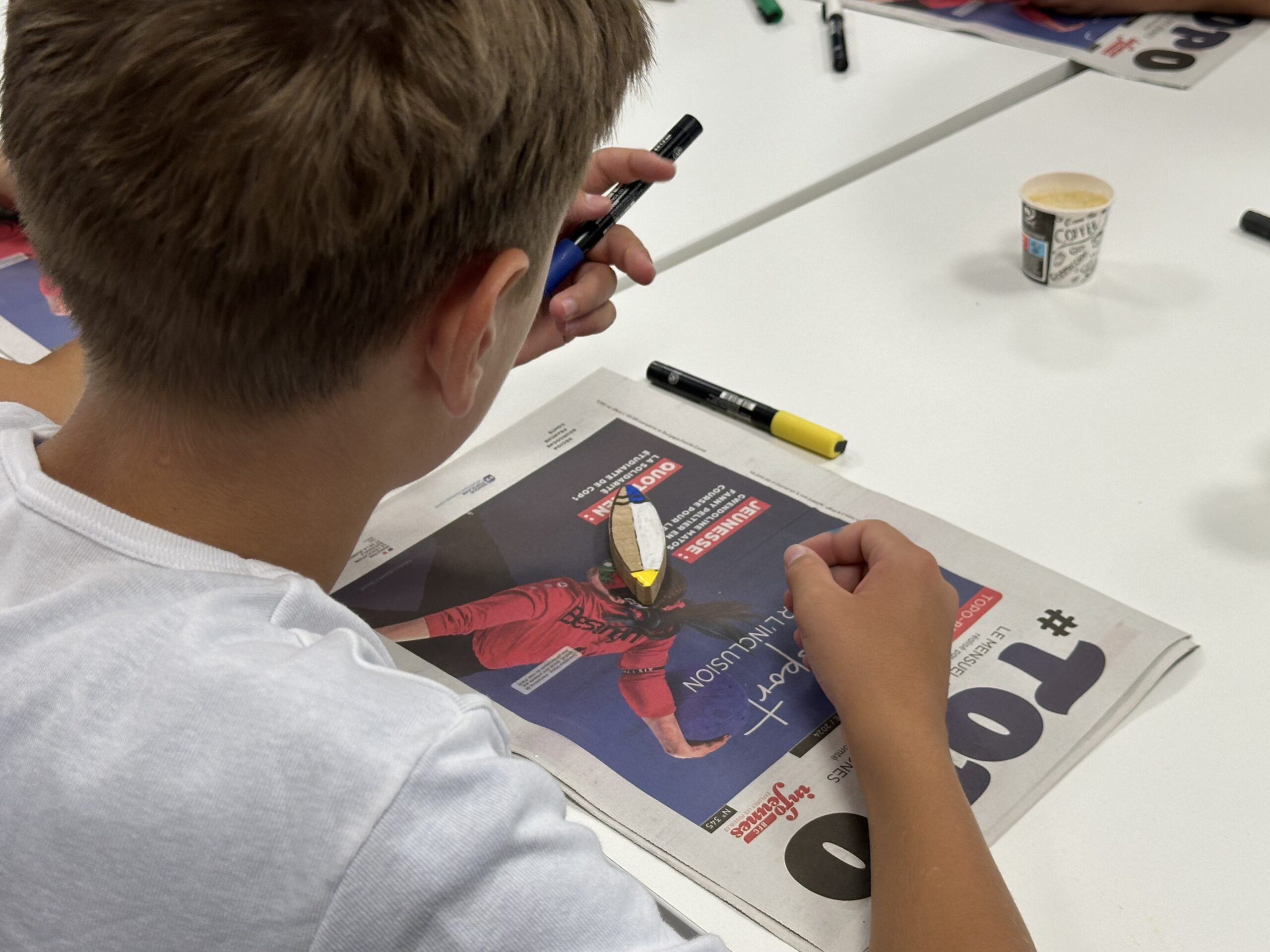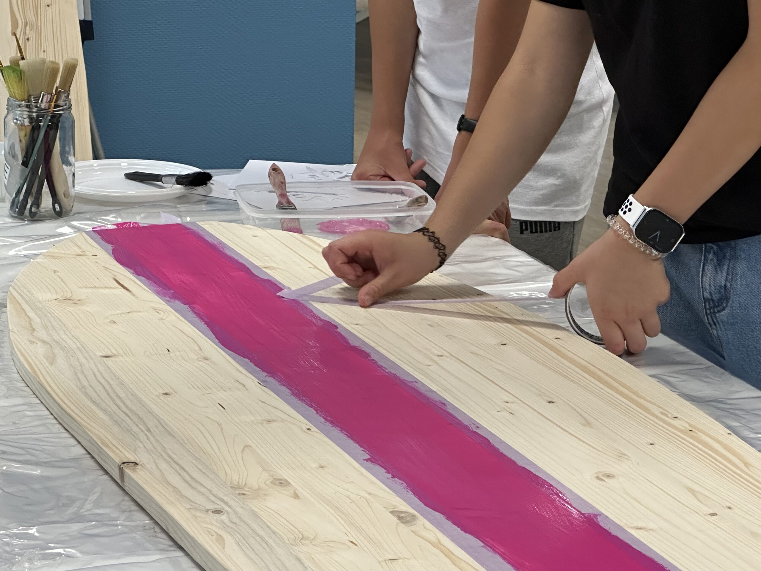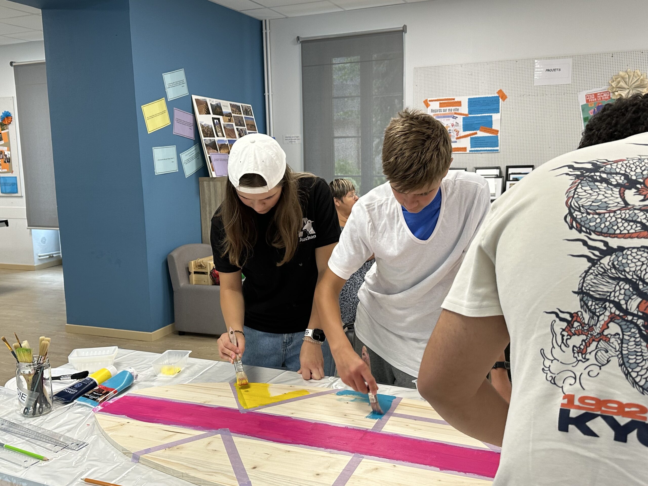 L’objectif du jour : peindre deux grandes planches en bois en forme de surfs, destinées à décorer les espaces d’accueil de Saint-Pantaléon et de Saint-Andoche. Dans une ambiance conviviale et détendue, chacun a pu imaginer des motifs colorés, en travaillant notamment la symétrie pour créer un décor harmonieux et évocateur des vacances. Un vrai vent d’évasion a soufflé sur l’atelier.