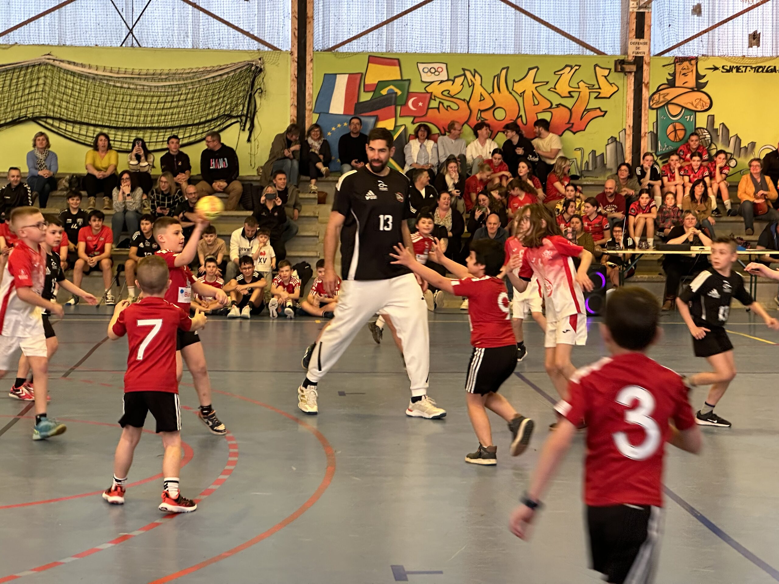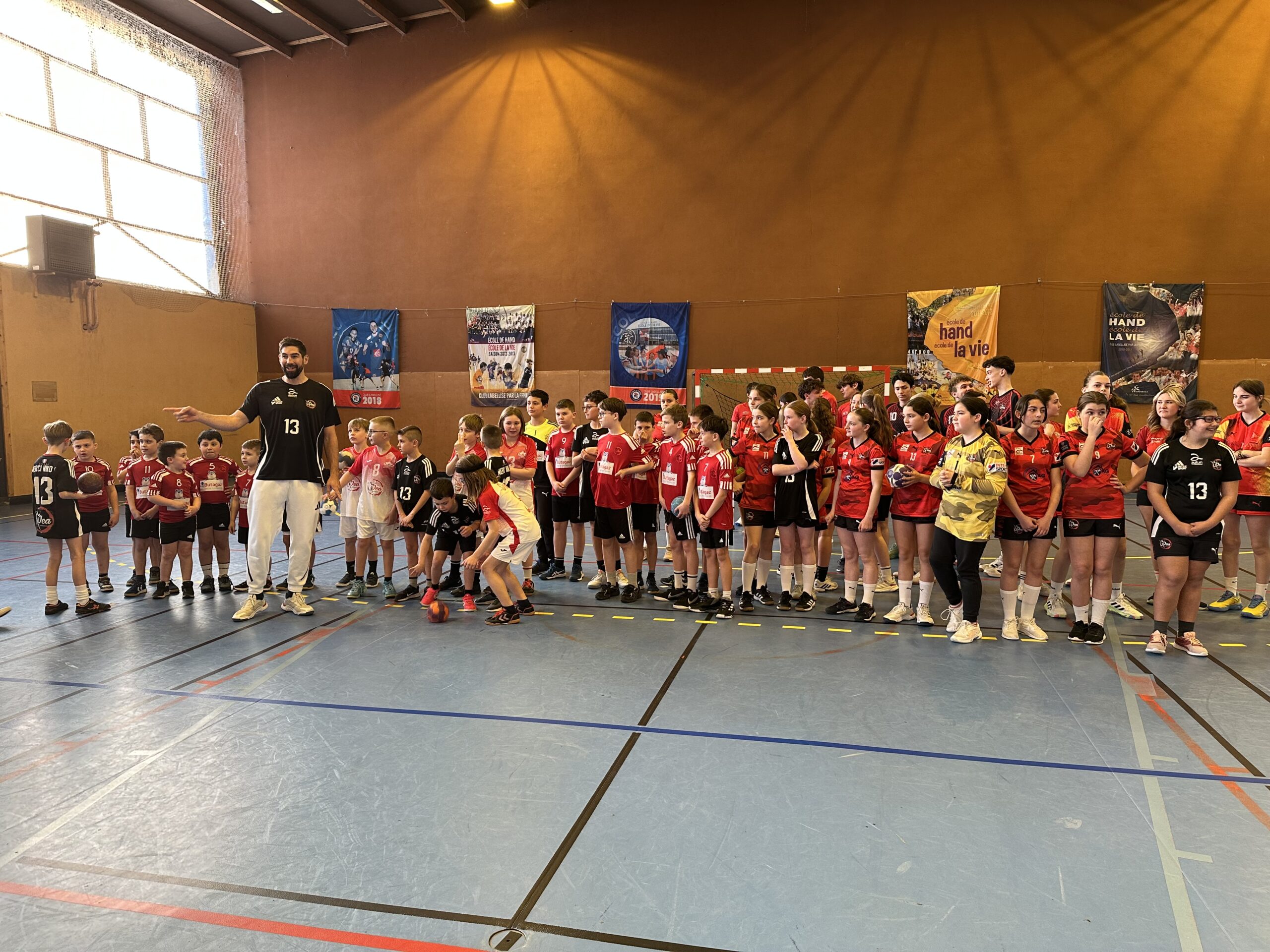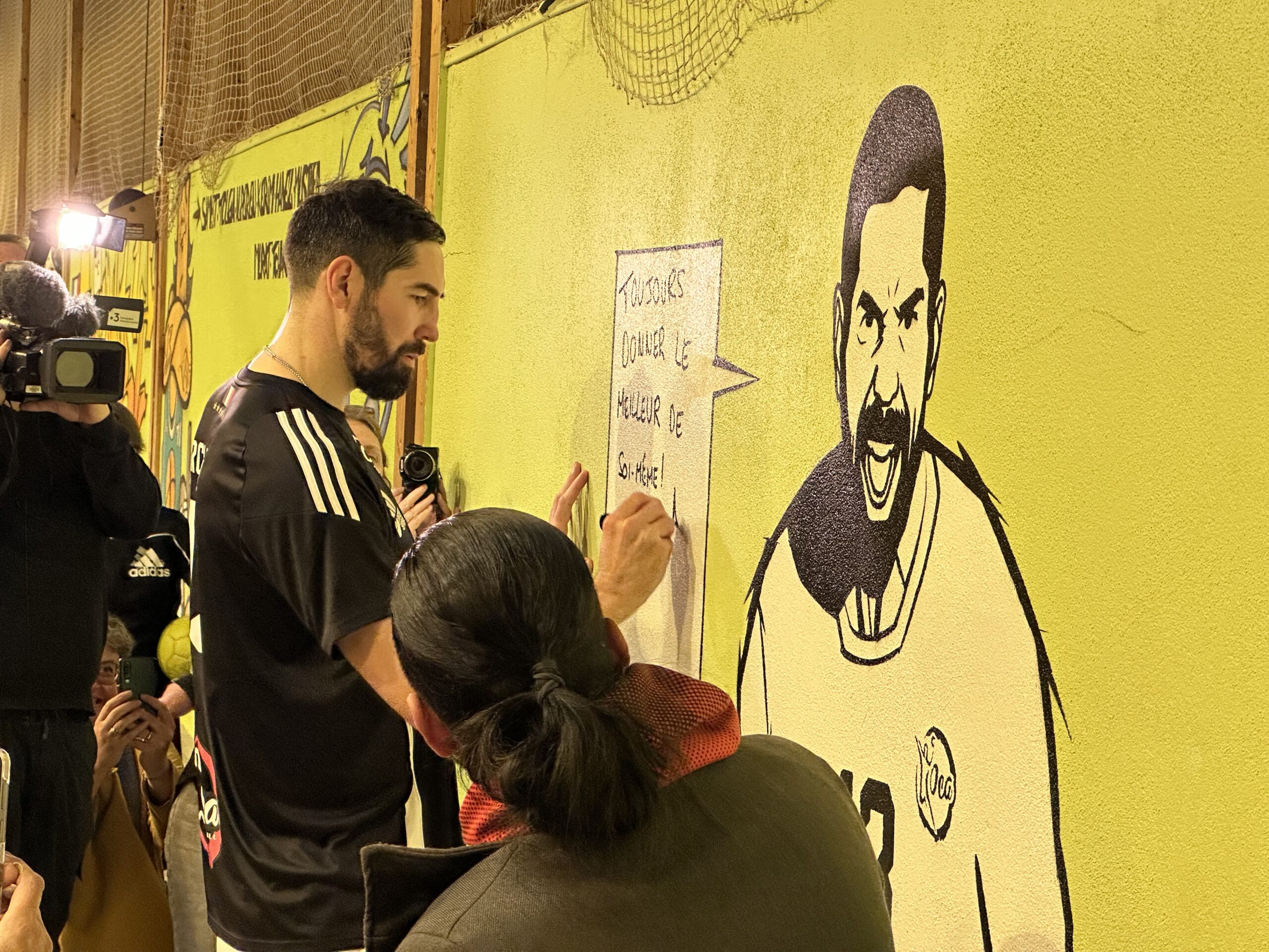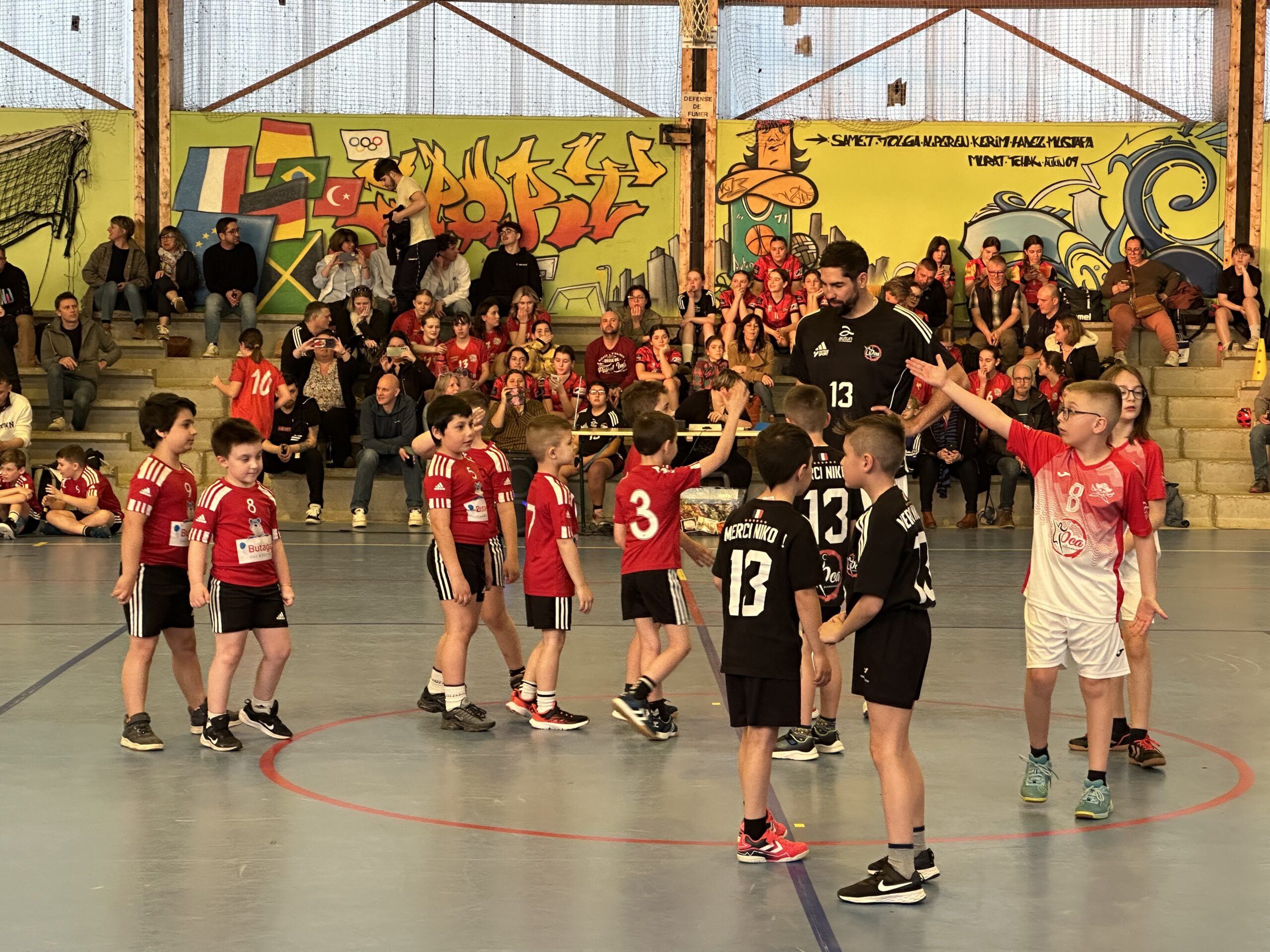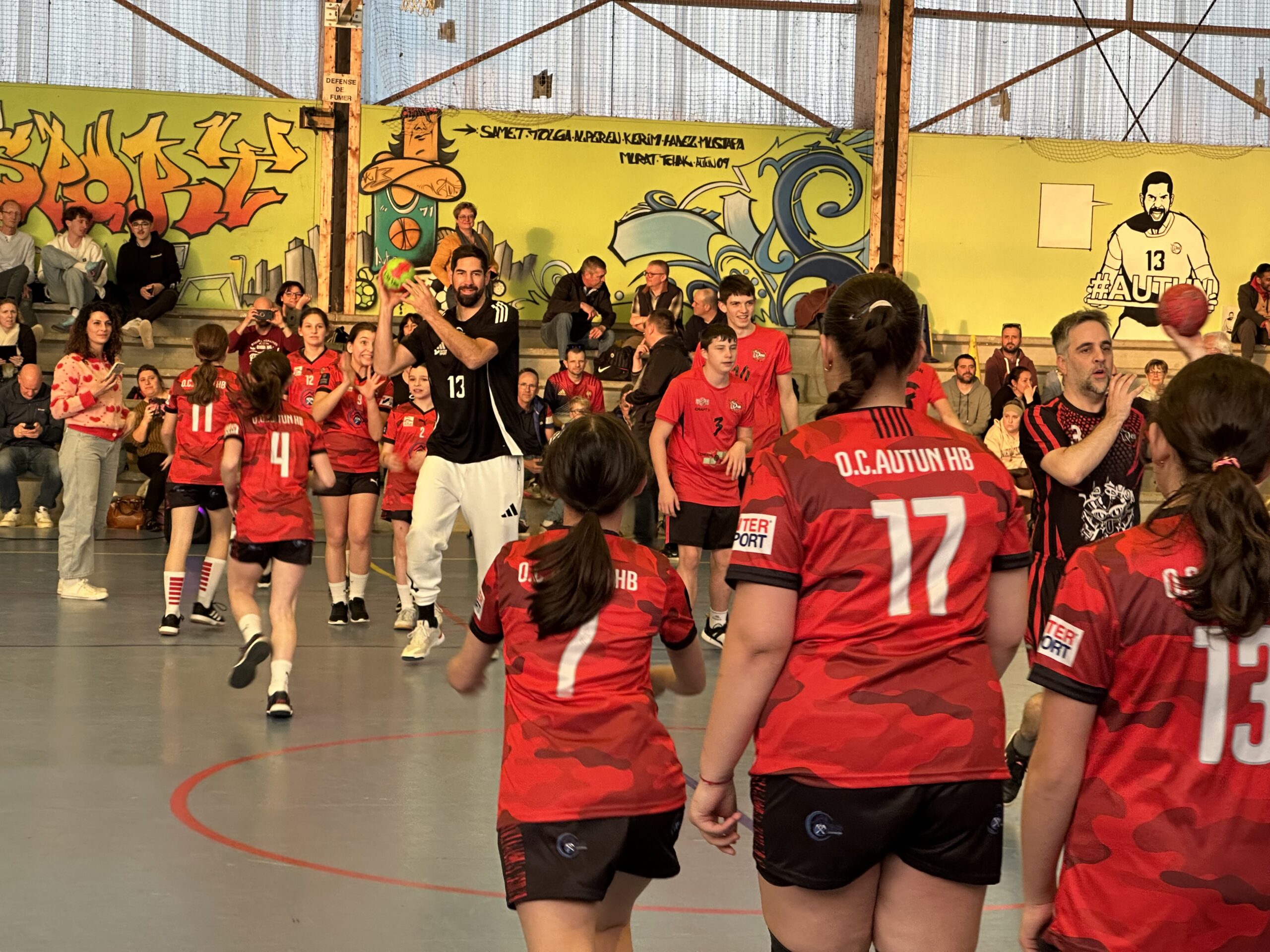 Pendant quelques heures, le sportif de haut niveau a partagé le terrain avec chaque équipe de l’OCA, d’abord pour un échauffement tous ensemble, puis pour de petits matchs, équipe par équipe. En-haut des gradins du gymnase Saint-Roch, Yas Munasinghe a également réalisé une superbe fresque représentant Nikola Karabatic, que l’athlète a signée.
