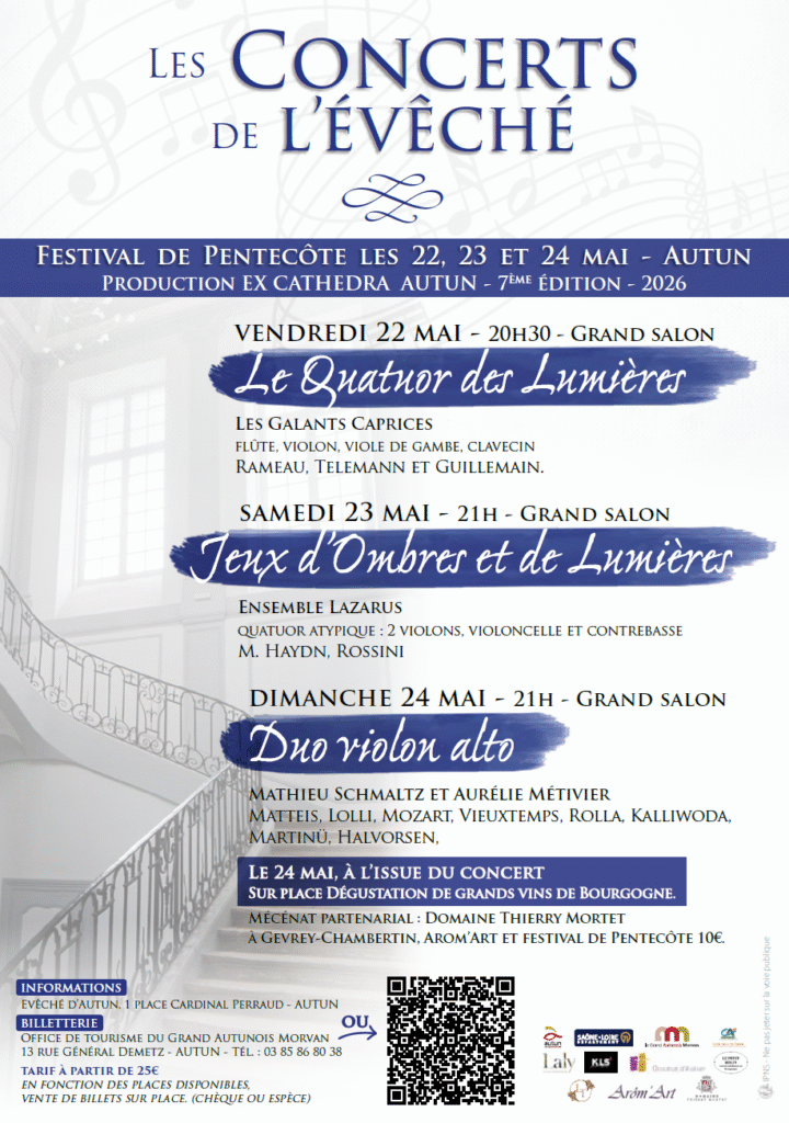 La musique classique s’invite de nouveau à Autun avec la 7e édition du Festival de Pentecôte – Les Concerts de l’Évêché, programmée du 22 au 24 mai 2026. Un rendez-vous désormais bien installé, qui se déroulera dans le cadre intimiste de l’évêché d’Autun, situé place Cardinal Perraud.