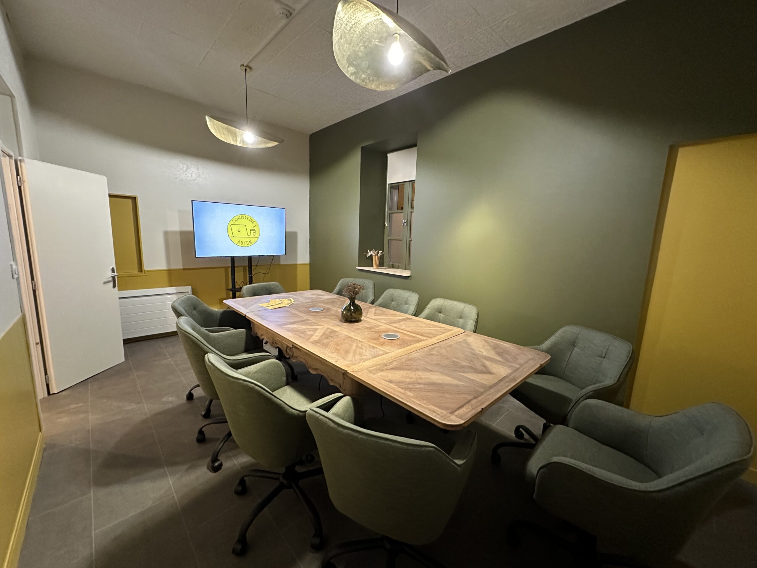 Au fond des locaux, une cuisine avec une grande table conviviale en plein centre, propice aux échanges et aux rencontres. Enfin, la salle de réunion privatisable. Les pièces de travail sont toutes insonorisées : un détail important qui permet de rester concentré sur sa besogne. Chacun peut réserver un bureau ou la salle de réunion à sa guise, directement en ligne, même au dernier moment. Avec votre réservation, vous pourrez accéder à l’espace de coworking grâce à un code à usage unique.
